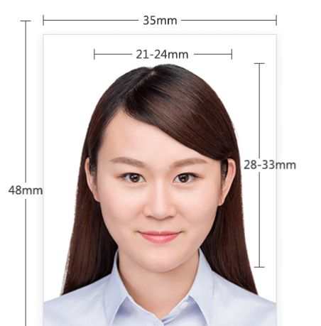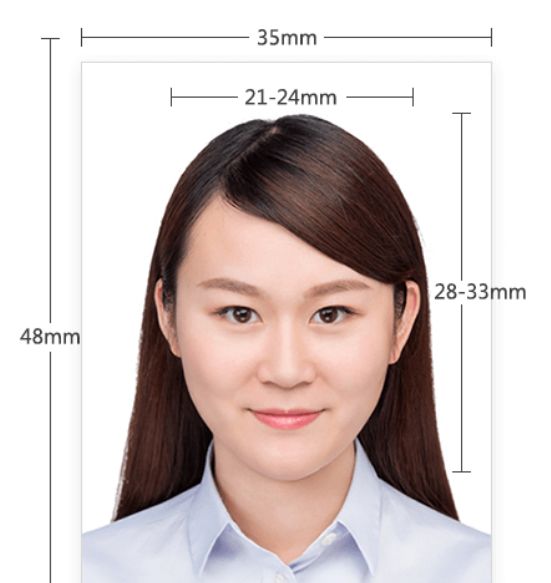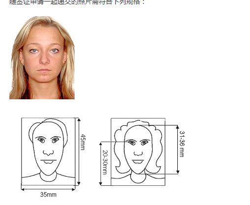 1、相片外沿大小必须为35毫米 X 45毫米 (1.37寸 X 1.77寸)。