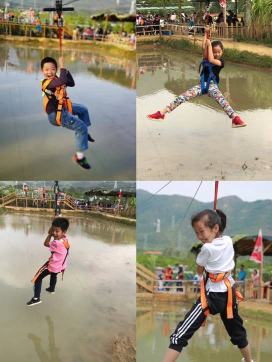 刺激好玩的水上溜索,每位小朋友是勇敢的小勇士,挑战自己,成功飞跃,欢呼雀跃,大家笑声鼓掌声响彻田园。