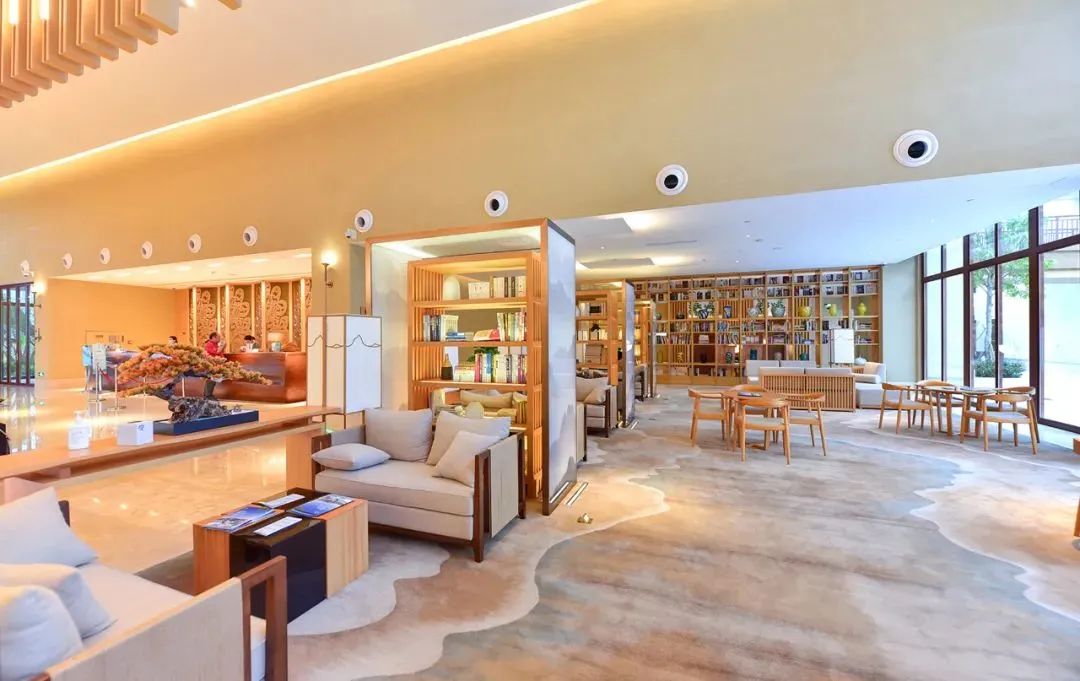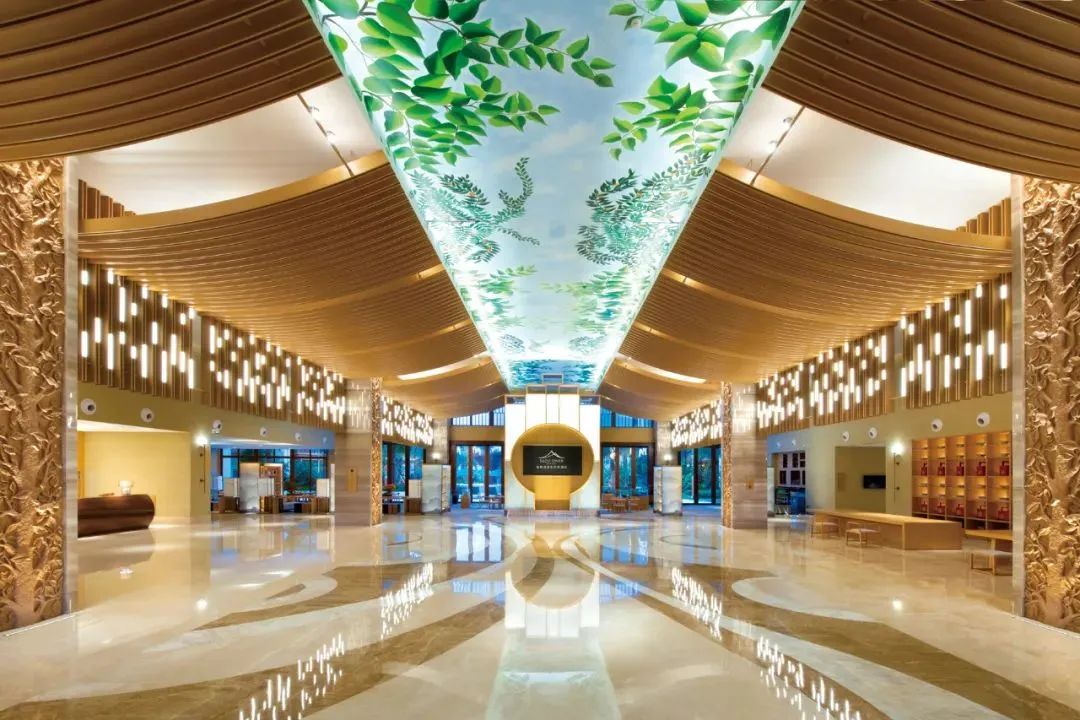 大堂结合地域文化特色,森林景观引入大堂大堂天花由造型木条延伸,顶上是叶子绘画形成花木繁华景象,柱子 的艺术叶子图案与空间相辅相成,整个大堂灵动、温馨。