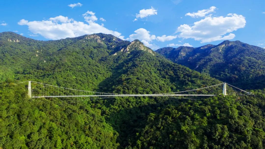 横跨在两座山峰上,长379米,离峡谷的高202米,梦幻6D效果,看涧谷纵横峡谷连,流银挂玉涌飞泉,俯瞰众生。