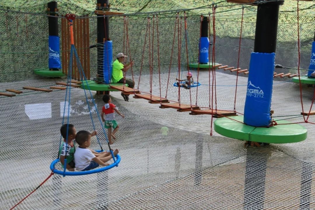 拓展训练、挑战自我。紧张刺激跨过一道道难关,设有亲子线和成人线,老少咸宜,与亲人一起扶持过关,促进亲子交流,增进感情,与朋友一起携手并进,留下一段难忘的记忆。