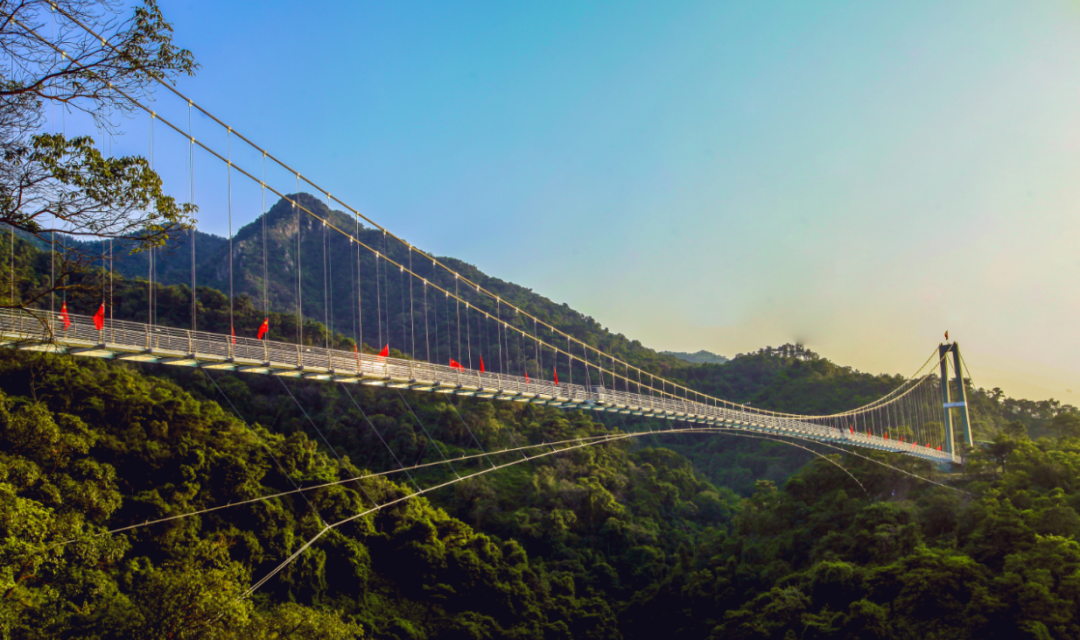 在古树与古树之间搭建成的索桥,跨过潺潺而过的山涧和激荡而出的瀑布,绿荫环绕、山花妩媚、翠鸟和鸣。一步一脚印,漫步跳跃,穿梭于树林中,享受唯美浪漫。